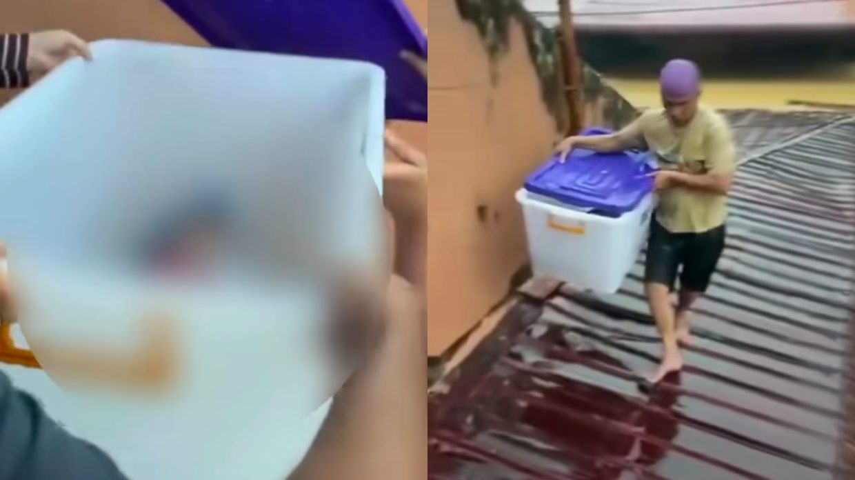 Dalam video tersebut, kelihatan seorang bayi diletakkan di dalam sebuah bekas plastik (container box) dipercayai sebagai usaha ibu bapanya untuk memastikan keselamatannya daripada dihanyutkan arus deras.