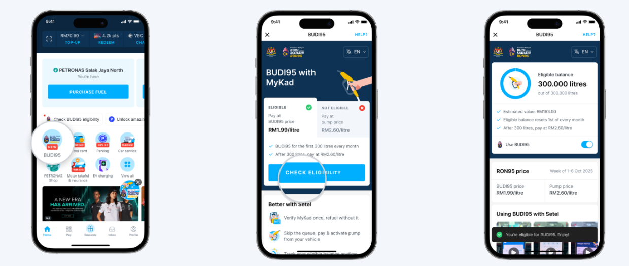Selain menggunakan MyKad di terminal pam, pengguna juga boleh mendapatkan harga subsidi melalui aplikasi rasmi stesen minyak seperti Setel (Petronas) atau Shell App selain menggunakan Touch n Go eWallet.