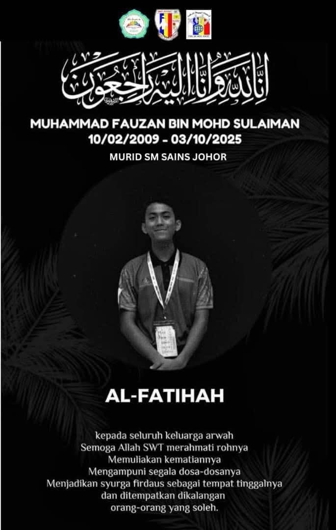Ketua Polis Daerah Ipoh, Asisten Komisioner Abang Zainal Abidin Abang Ahmad berkata, bedah siasat ke atas mayat Muhammad Fauzan Mohd Sulaiman, 16, murid dari Sekolah Menengah Sains (SMS) Johor itu dijalankan pada Jumaat di Jabatan Forensik Hospital Raja Permaisuri Bainun (HRPB), Ipoh.