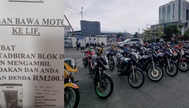 Menurut memo berkenaan, pengurusan perumahan itu menegaskan larangan membawa motosikal ke dalam lif dan memberi amaran bahawa tindakan sedemikian boleh dikenakan denda RM200.