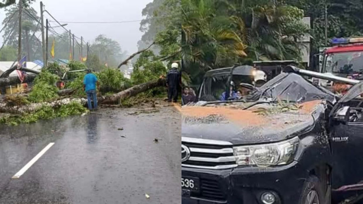 “Komander Operasi melaporkan sebatang pokok tumbang menghempap sebuah kenderaan pacuan empat roda yang melibatkan seorang mangsa lelaki Melayu dipercayai telah meninggal dunia.