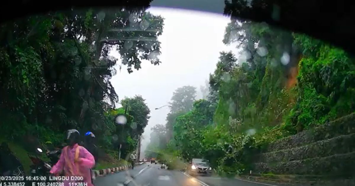 Dalam kejadian sekitar 4.45 petang di Jalan Tun Sardon itu, rakaman dari kamera papan pemuka (dashcam) melihatkan satu runtuhan berlaku.