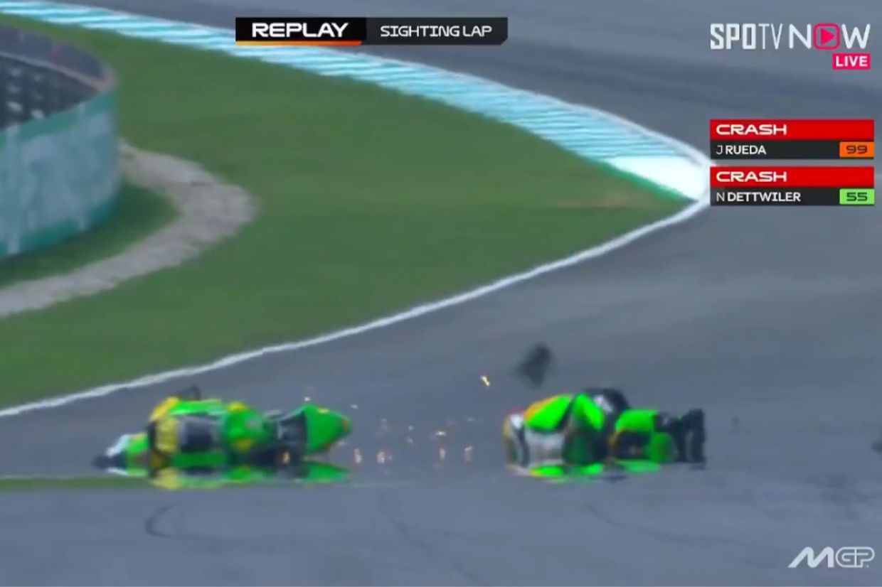 Insiden tersebut melibatkan juara dunia Moto3 baharu, Jose Antonio Rueda yang dikatakan melanggar pelumba Noah Dettwiler yang sedang bergerak perlahan pada ketika itu.