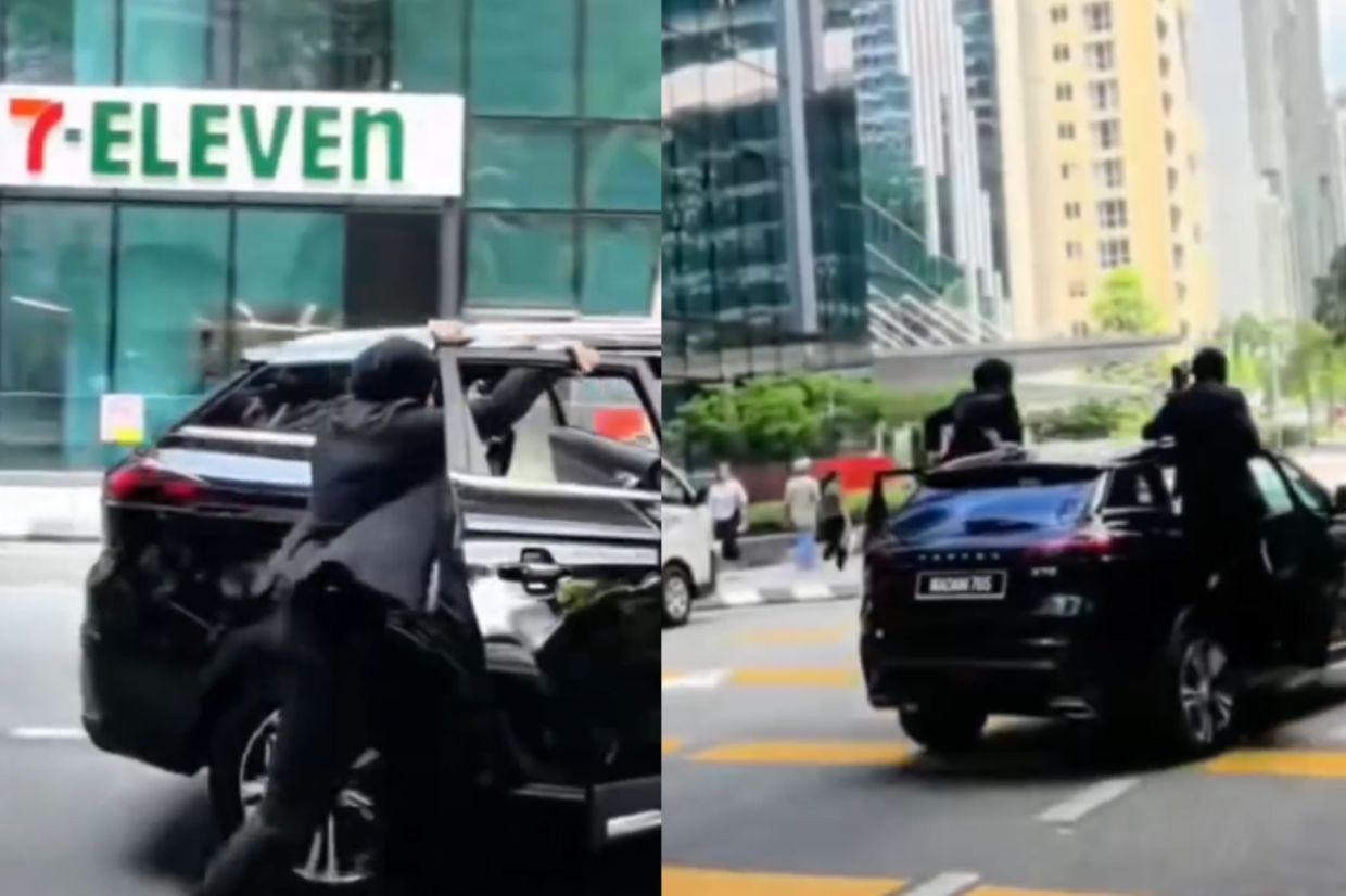 Menerusi perkongsian pengguna Nutrigrace di laman Threads, dua anggota pengawal keselamatan itu dilihat melompat masuk ke dalam kenderaan utiliti sukan (SUV) yang sedang bergerak dengan gerakan serentak dan penuh ketepatan.