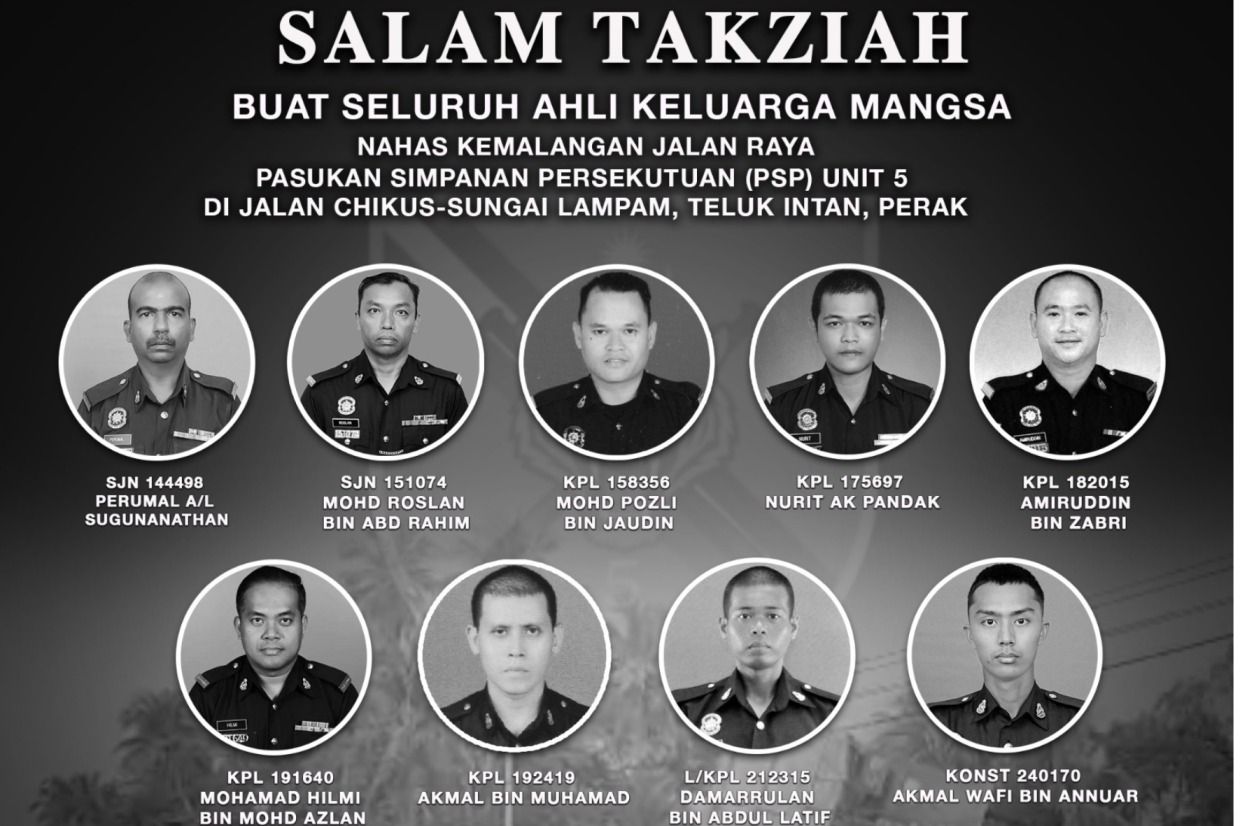 Insiden itu menyebabkan sembilan anggota terkorban, dua cedera parah sementara tujuh yang lain mengalami kecederaan ringan ketika dua kemalangan itu bertembung di Jalan Chikus-Sungai Lampam dekat Teluk Intan, Perak pada 13 Mei lalu.