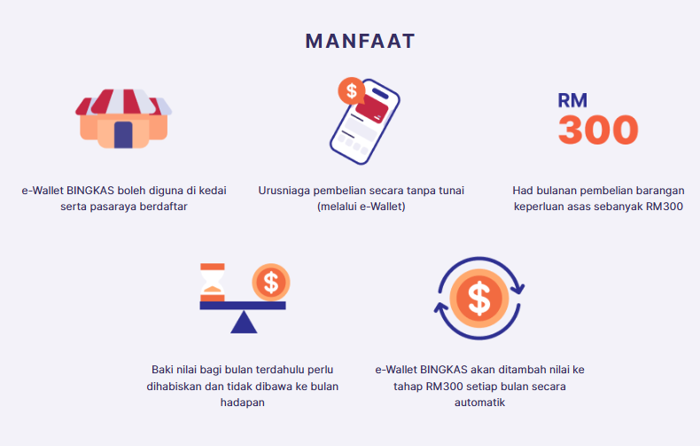 Melalui bantuan ini, penerima akan menerima baki e-Wallet bernilai RM300 setiap bulan yang boleh digunakan di kedai dan pasar raya berdaftar untuk pembelian barangan keperluan asas secara tanpa tunai.