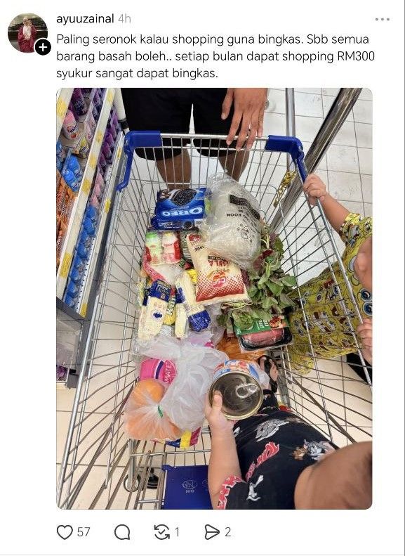 "Paling seronok kalau shopping guna BINGKAS. Sebab semua barang basah boleh beli. Setiap bulan dapat shopping RM300 bersyukur sangat dapat bantuan ini," katanya di Threads.