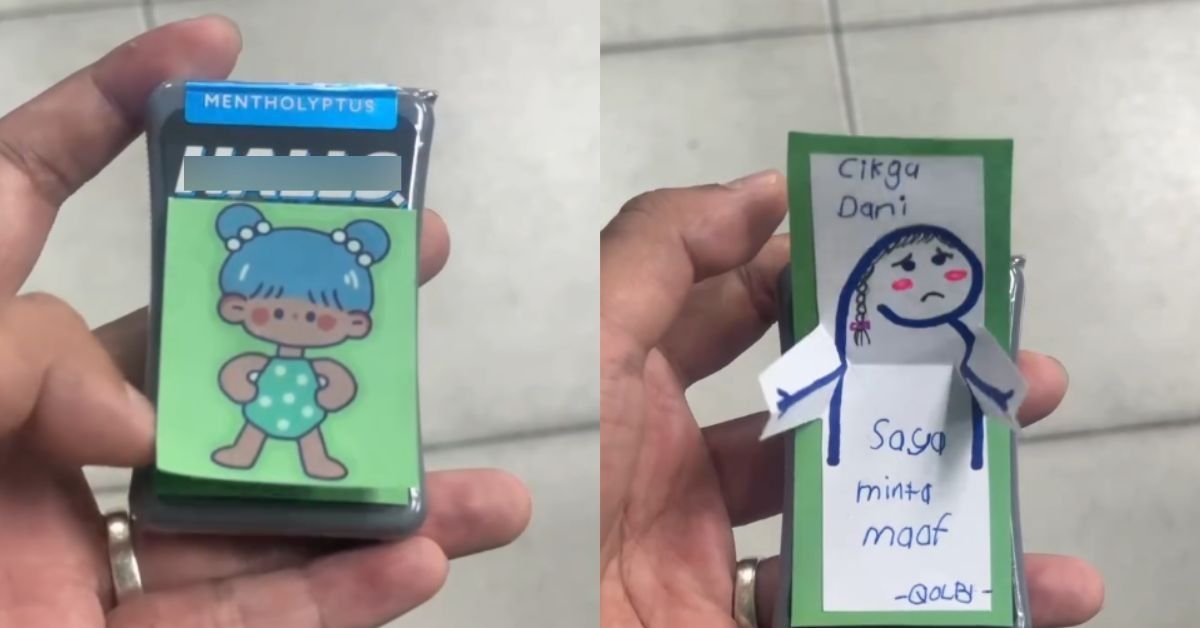 Anak murid Dani menggunakan cara kreatif dalam meminta maaf dengan mengubah suai kotak gula-gula dan dihiasi dengan lakaran menarik serta mesej, "Cikgu Dani, saya minta maaf."