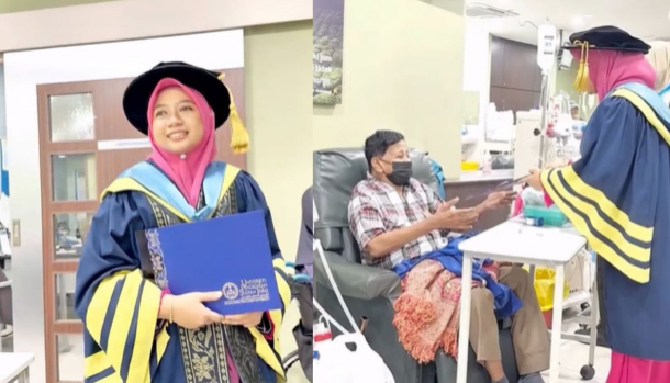 MOMEN mengharukan terpancar dalam satu video tular memaparkan tindakan seorang graduan doktor falsafah (PhD) yang singgah ke pusat dialisis demi berkongsi detik kejayaannya bersama insan tersayang.