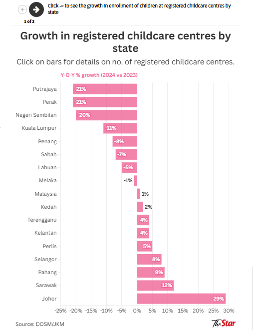 Walaupun bilangan pusat jagaan kanak-kanak di ketiga-tiga kawasan itu berkurang, jumlah kanak-kanak yang mendaftar meningkat 8% di Kuala Lumpur, 10% di Putrajaya dan 33% di Perak, mencerminkan peningkatan permintaan.