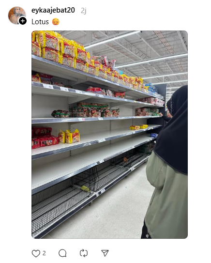 EykaJebat20 turut berkongsikan situasi di Lotus dengan menunjukkan keadaan rak makanan hampir kosong dipercayai habis diborong oleh warga setempat.
