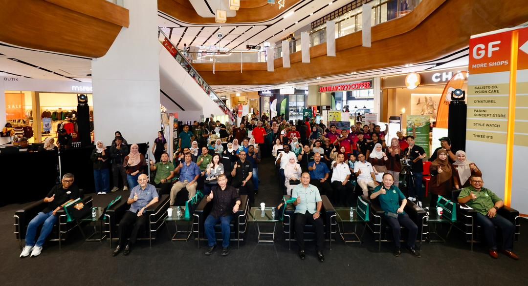 (Duduk, tiga dari kiri) Razali Mohamad bersama para pengunjung yang hadir memeriahkan Majlis Perasmian Penutup Jelajah Sawit Hijau MPOGCF 2025 dan Pelancaran Buku Panduan Pengecaman Tapak Hidupan Liar Di Lapangan yang berlangsung di Melawati Mall, Pusat Bandar Melawati, Kuala Lumpur pada Sabtu.