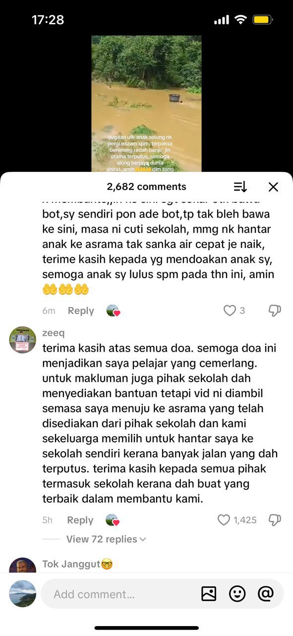 "Saya pun ada bot sendiri tapi tak boleh lalu ke sini, orang nak tolong bawa bot ke sini lagi lah susah. Tapi sekarang alhamdulillah air dah surut," jelasnya membalas komen orang ramai.