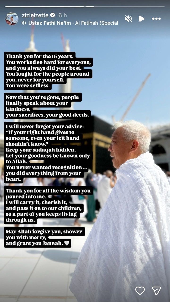 Menerusi perkongsian di Insta Story pada Ahad, Zizie, 47, menyatakan bahawa arwah suaminya sentiasa bekerja keras demi orang sekeliling dan memberikan sepenuh komitmen sepanjang 16 tahun mereka bersama.