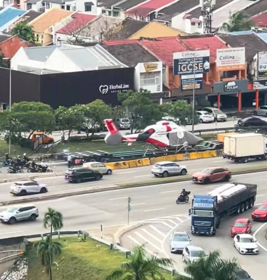 Sebuah lori treler panjang yang membawa muatan helikopter dilihat menghalang laluan ambulans.
