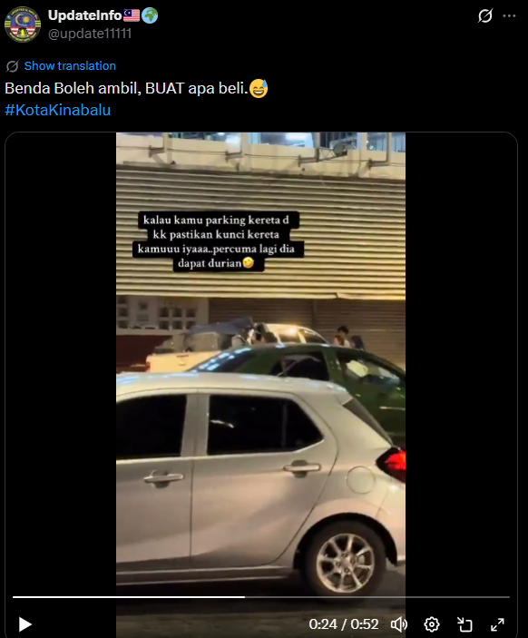 "Kalau kamu parking kereta di KK (Kota Kinabalu) pastikan kunci kereta kamu ya. Percuma lagi dia dapat durian," pesan video yang dimuat naik oleh akaun X, updateinfo.