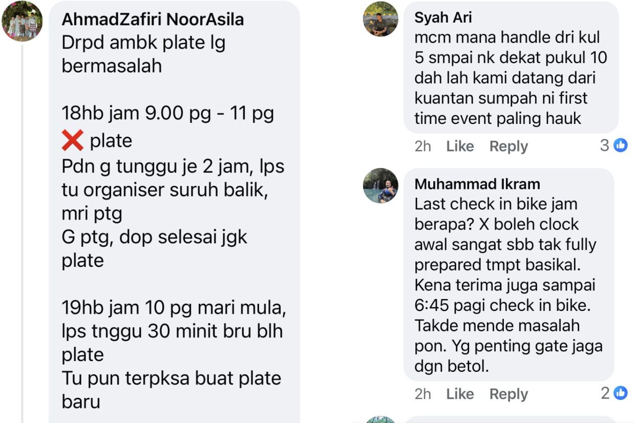 "Keesokan hari datang pukul 10 pagi, tunggu lagi sebelum dapat nombor pelumba. Itu pun terpaksa buat nombor baharu. Acara flag off MTB pula lewat 30 minit,” katanya.