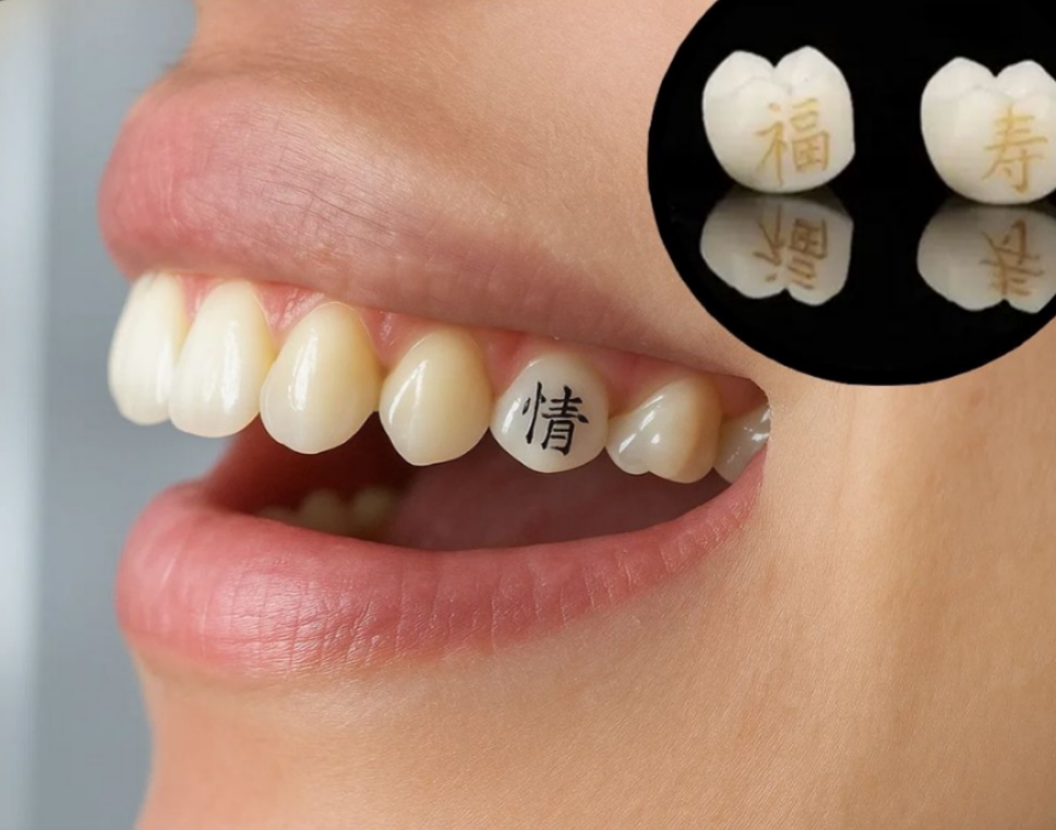Seorang wanita dari Jinan, wilayah Shandong, misalnya, memilih huruf Cina shen yang bermaksud berhati-hati untuk diukir pada crown giginya.