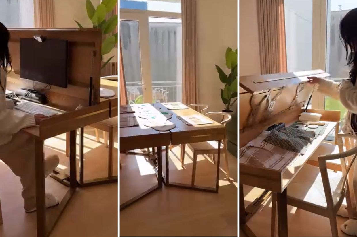 Seperti dalam perkongsian @mybrooklynapartment, meja komputer boleh diubah suai menjadi meja makan dengan menambah elemen penyimpanan di bawahnya.