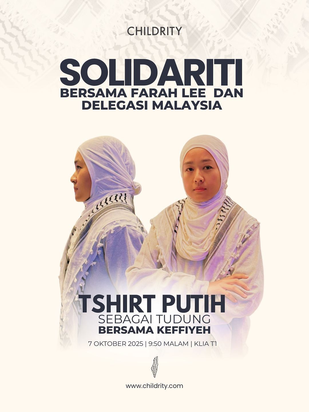 "Mari kita sama-sama penuhi KLIA dengan berpakaian baju-T putih sebagai simbol hijab, tanda sokongan dan kasih terhadap delegasi wanita Malaysia serta wanita-wanita di Palestin yang terus berjuang dalam penindasan," serunya.