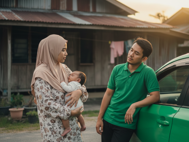Suami mengambil keputusan menjadi pemandu e-hailing sepenuh masa, manakala isterinya pula bekerja sebagai ejen takaful sambil menguruskan rumah tangga dan anak kecil.
