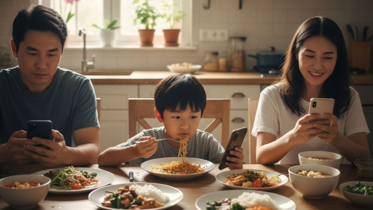 "MAKAN malam menjadi sepi, hanya bunyi sudu dan skrin yang bercahaya. Kita duduk di hadapan anak, tetapi jaraknya seperti beribu batu."