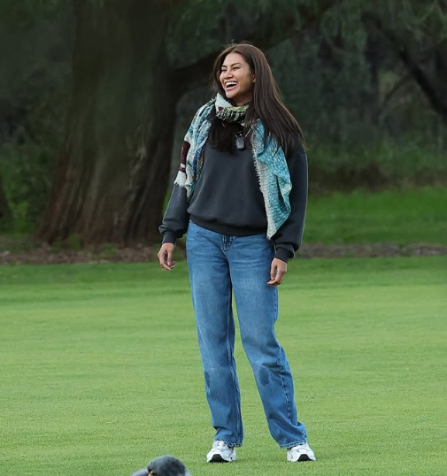 Di kawasan taman berumput hijau, Che Puan Mahkota Khaleeda memilih sweatshirt hitam dipadankan dengan seluar jean potongan longgar, digayakan bersama skaf Chanel bermotif hijau dan biru menambah sentuhan mewah pada penampilan kasual.