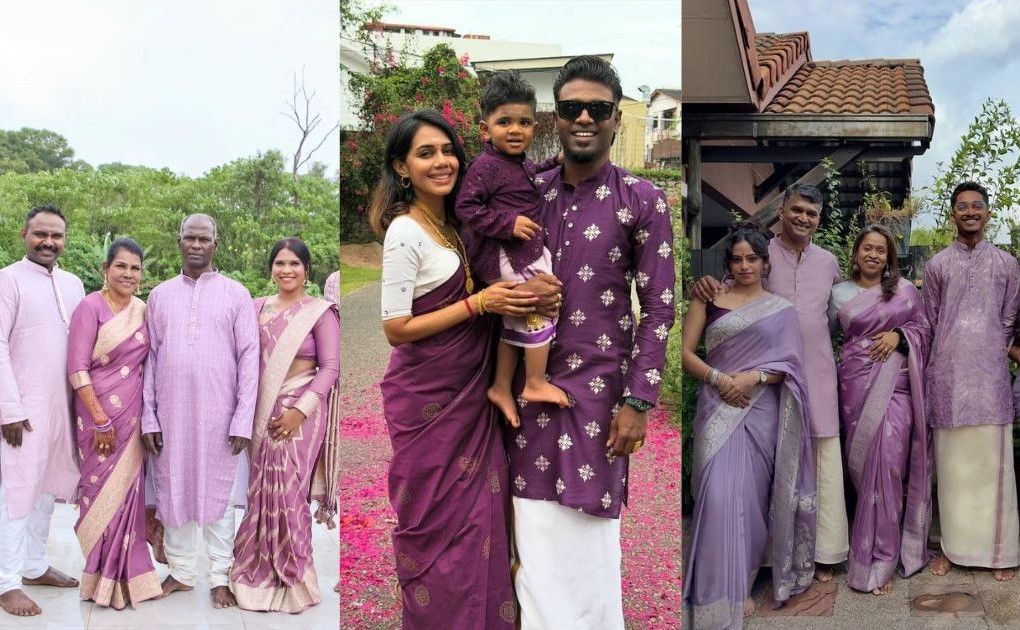 Pelbagai hantaran memaparkan keluarga dan rakan-rakan tampil sedondon dalam busana sari, lehenga dan kurta ungu.