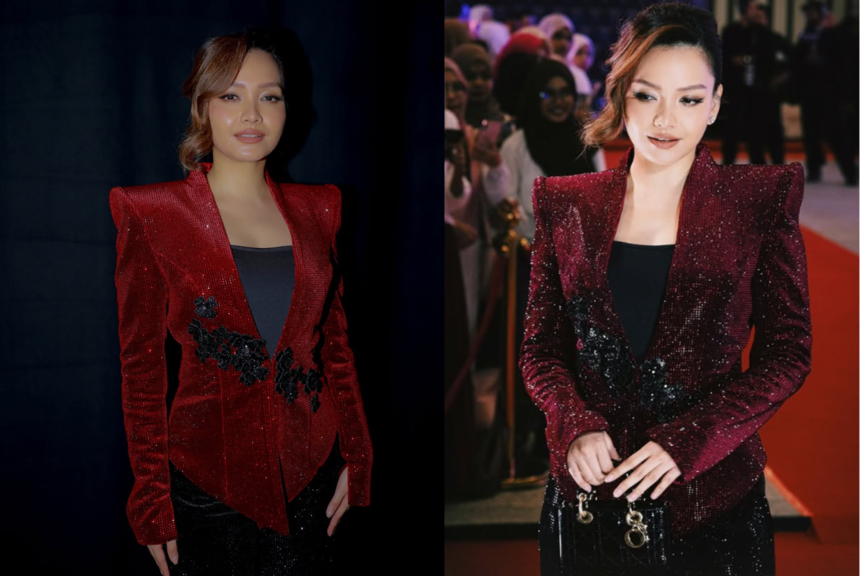 Sementara itu, pelakon dan penyanyi, Azira Shafinaz tampil berani dengan baju inner hitam yang dipadankan bersama blazer merah berstruktur sentuhan Rizman Ruzaini.