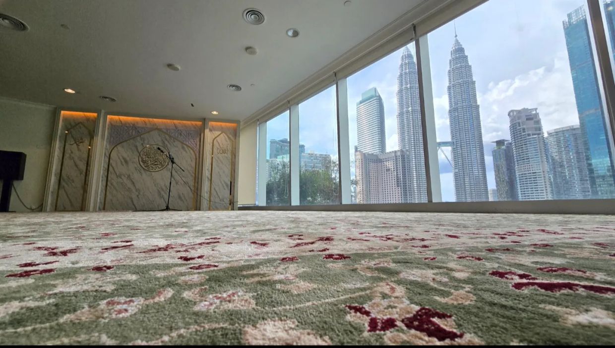 Bahagian paling menjadi tumpuan sudah tentu dinding kaca yang menghadap panorama pencakar langit termasuk Menara Berkembar KLCC, menjadikan ruang solat tersebut antara yang tercantik dari segi pemandangan.