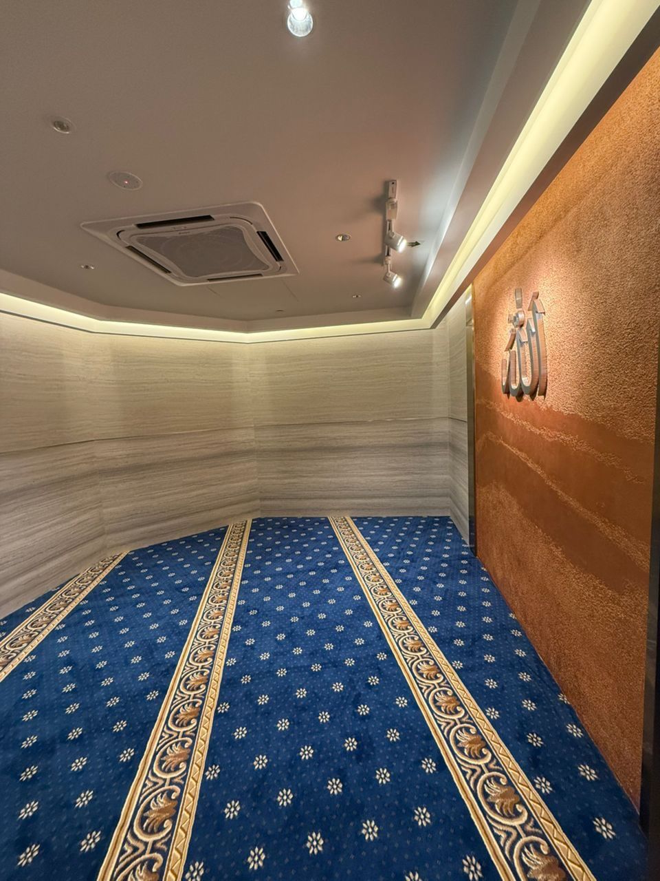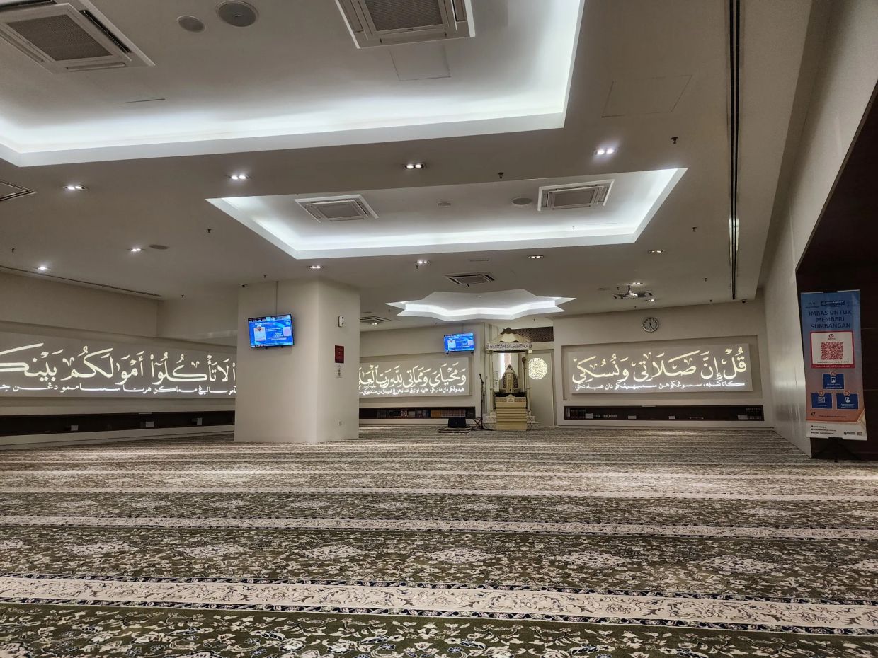 Pencahayaan lembut, karpet bercorak lembut dan susun atur ruang yang kemas memberikan suasana tenang untuk jemaah berehat seketika daripada kesibukan kerja.