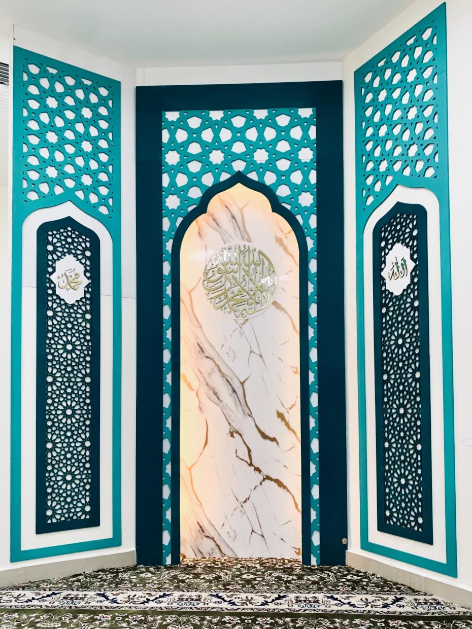 Mihrabnya berasaskan kemasan marmar cerah lengkap ukiran kaligrafi, sementara pencahayaan cahaya hangat (warm light) di belakang panel menambah sentuhan eksklusif.