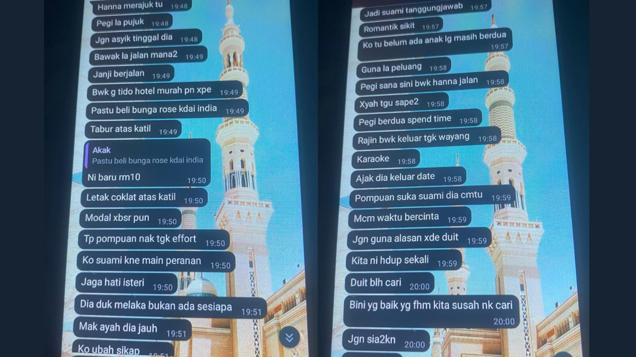 "Kau suami kena main peranan, jaga hati isteri. Dia duduk Melaka bukan ada sesiapa, mak ayah dia jauh. Kau ubah sikap, jadi suami bertanggungjawab, romantik sikit."