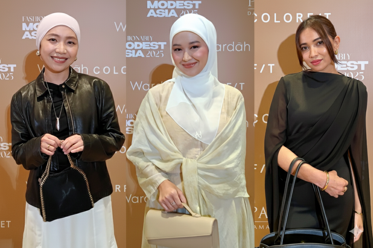 LIMA wanita mempamerkan gaya tersendiri, namun tetap selari dengan satu tema iaitu pilihan rona selamat seperti krim, putih dan hitam ketika menghadiri Fashionably Modest Asia (FMA) 2025 di Kuala Lumpur pada Rabu lalu.