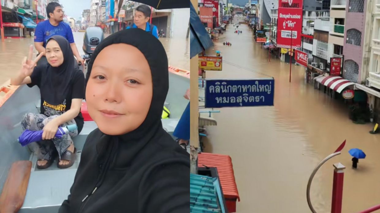 SEORANG wanita dan rakannya yang merupakan rakyat Malaysia terpaksa meredah banjir sejauh kira-kira enam kilometer (km) untuk mendapatkan bekalan makanan selepas kawasan mereka dinaiki air di Hat Yai, Thailand.