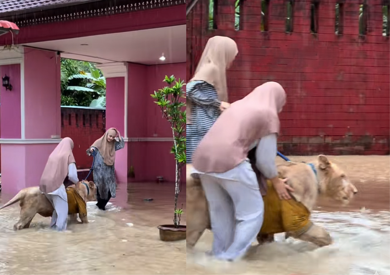 Rentetan kejadian itu, tular rakaman memaparkan kegigihan dua orang wanita menyelamatkan seekor singa peliharaannya daripada hanyut dibawa arus banjir.