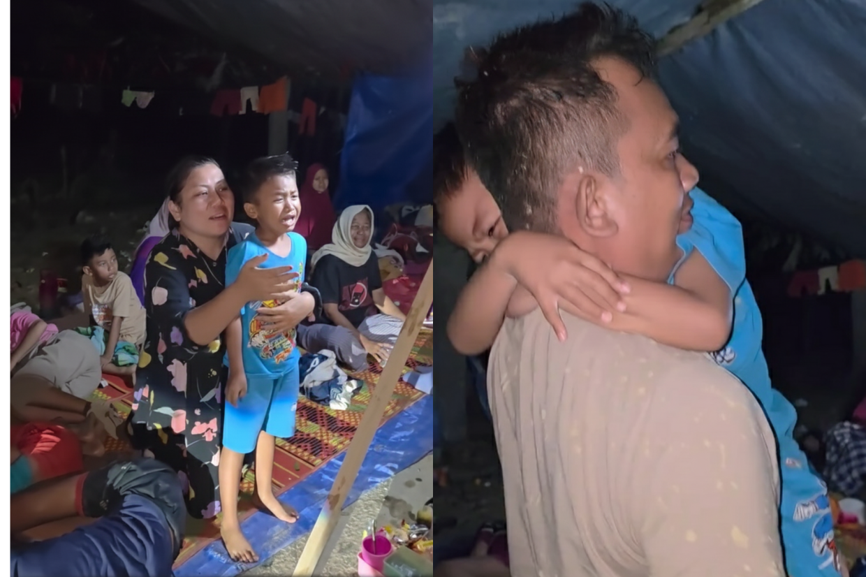 Sebaik tiba di lokasi teduhan, detik paling menyentuh ialah apabila anak lelakinya yang berusia lingkungan empat tahun menangis teresak-esak ketika melihat sosok bapanya sambil menyebut 'ayah' berulang kali.
