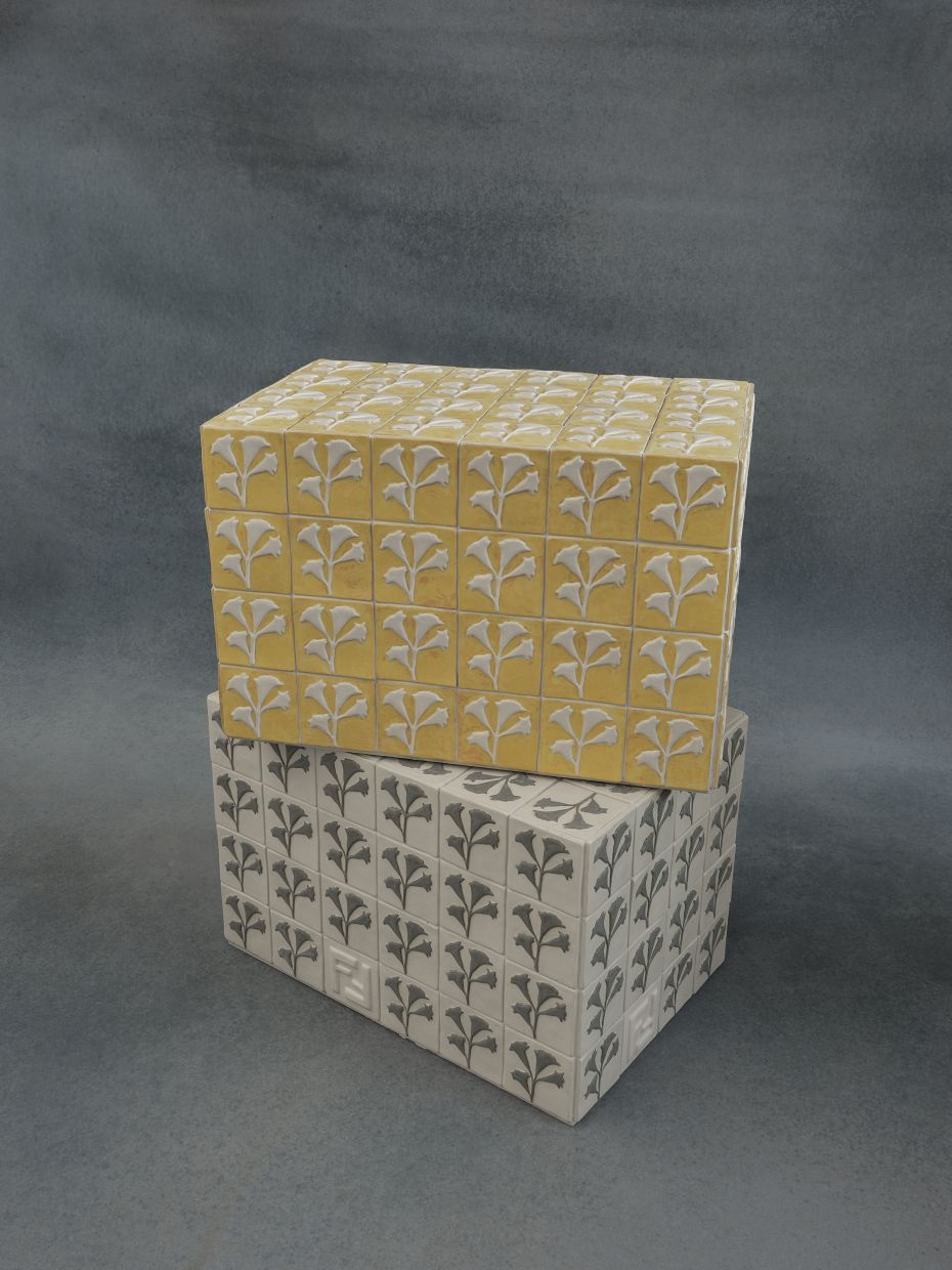 Satu siri bangku modular dan meja kiub pula dibina daripada jubin seramik timbul tempahan khas.