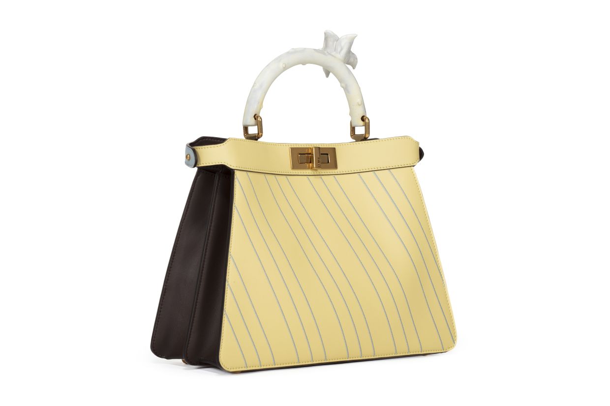 Vallese telah mereka semula Peekaboo sebagai model boleh balik dalam kulit anak lembu berjalur diagonal kuning pucat dan biru lengkap dengan perincian seramik yang diukir tangan.