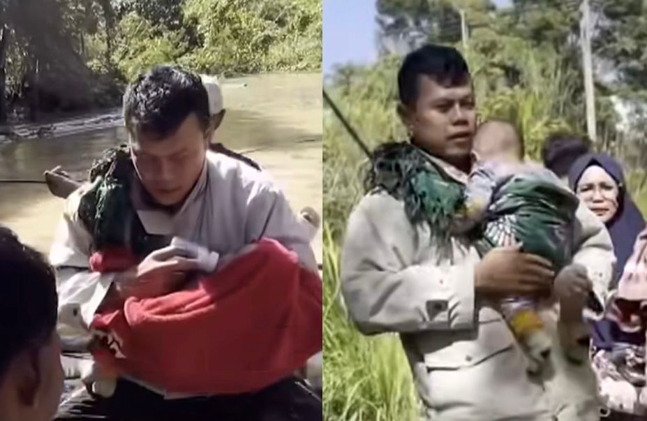 Menerusi video tular di media sosial sejak Sabtu, lelaki bernama Jamuri itu terpaksa berjalan kaki meredah kawasan tanah runtuh sambil mendukung bayinya yang sedang sakit.