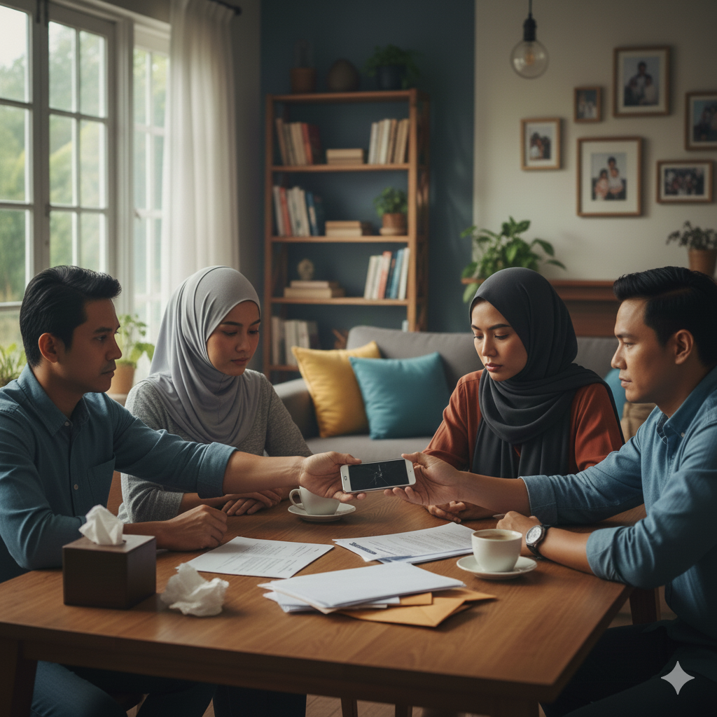 Keluarga arwah berkumpul dan menyerahkan telefon kepada kakak arwah, menandakan semua urusan digital tidak dapat diakses. — Gambar hiasan