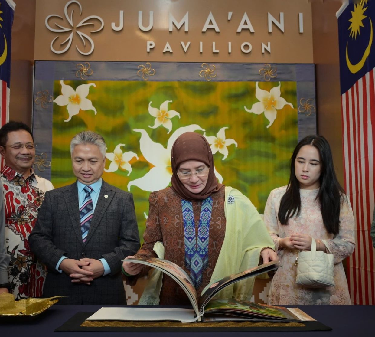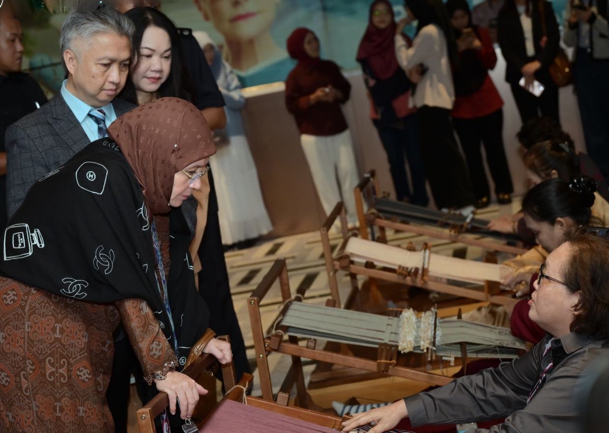 Tunku Azizah (tengah) ketika sesi lawatan ke Seminar Festival Tekstil Antarabangsa Borneo, Sarawak. — Facebook/Kesultanan Pahang