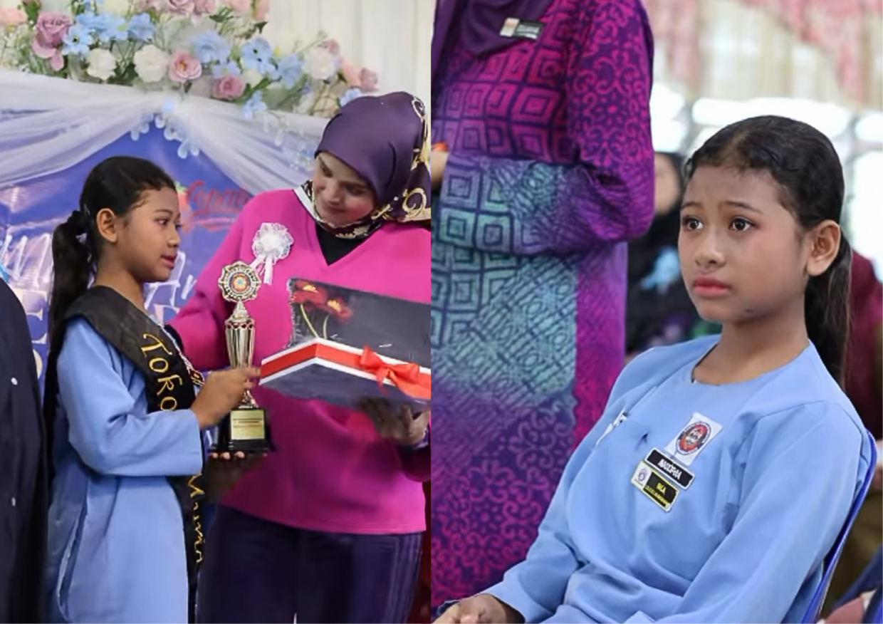 Penerima anugerah tersebut, Mia Sofhia gagal menahan sebak ketika namanya diumumkan sebagai Tokoh Murid dalam majlis rasmi anjuran pihak sekolah baru-baru ini.