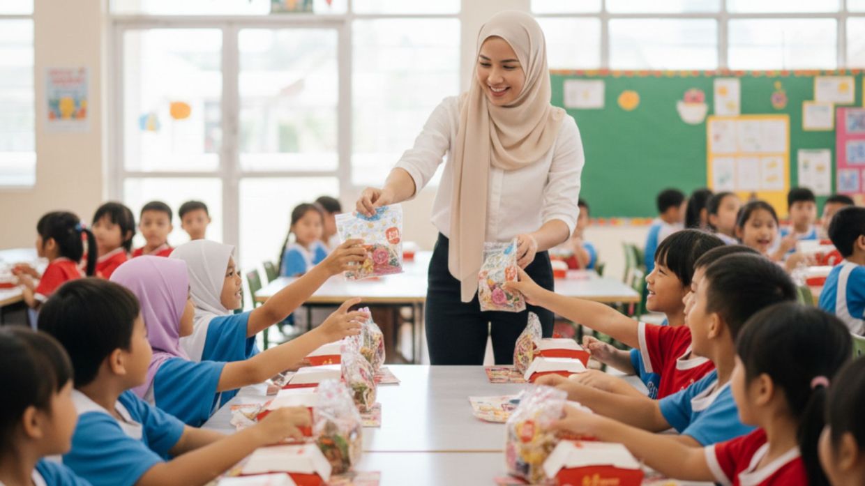 Katanya, dengan kutipan RM10 seorang, guru membeli set makanan segera lengkap dengan hadiah kecil untuk setiap murid.