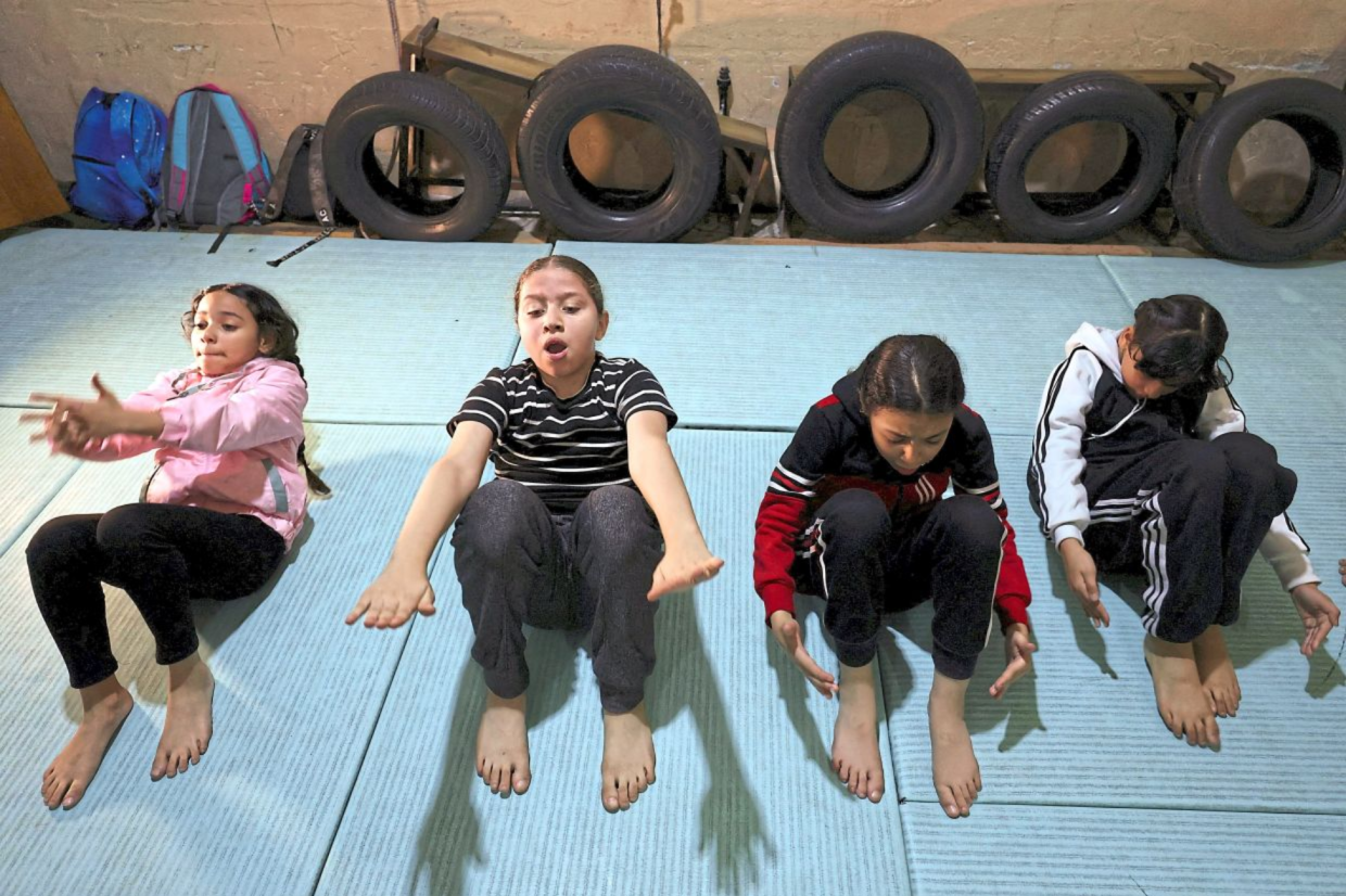 DI sebuah dewan sempit, tidak lebih besar daripada ruang tamu di bandar kelas pekerja Delta Nil, Mansoura, sekumpulan gadis bergelut, terjatuh dan bangun semula di atas tikar lusuh.