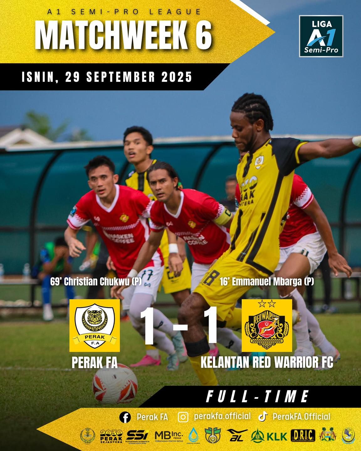 RENTETAN tiga kemenangan berturut-turut dicatatkan Perak FA dalam saingan Liga A1 Semi Pro 2025/26 berakhir selepas pasukan itu seri ketika menentang Kelantan Red Warriors (KRW) FC.