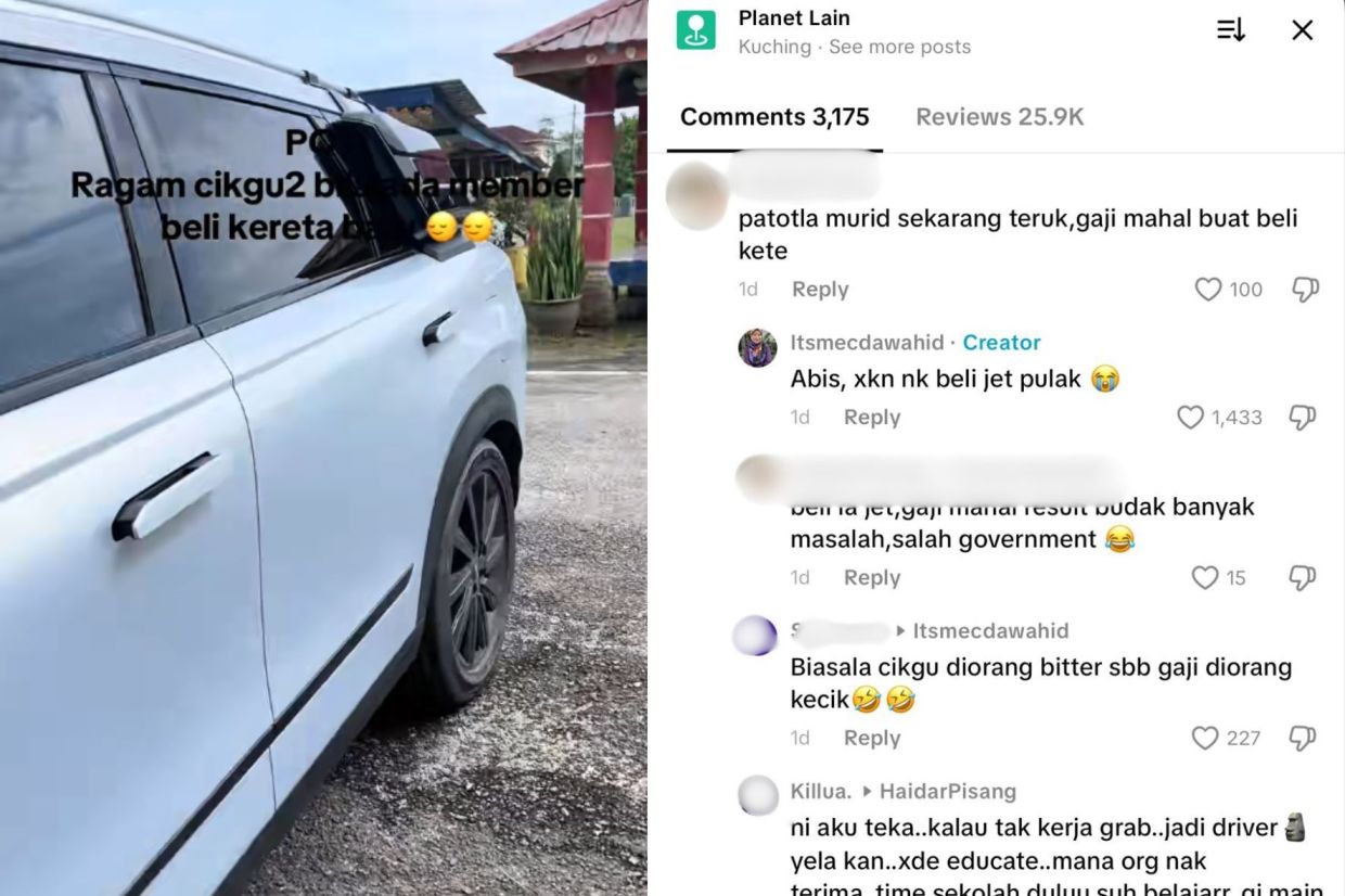 “Cikgu dulu bawa motor kapcai pun bangga. Sekarang baru dua tiga tahun kerja, dah tayang kereta mewah,” kata @SuriHati89.