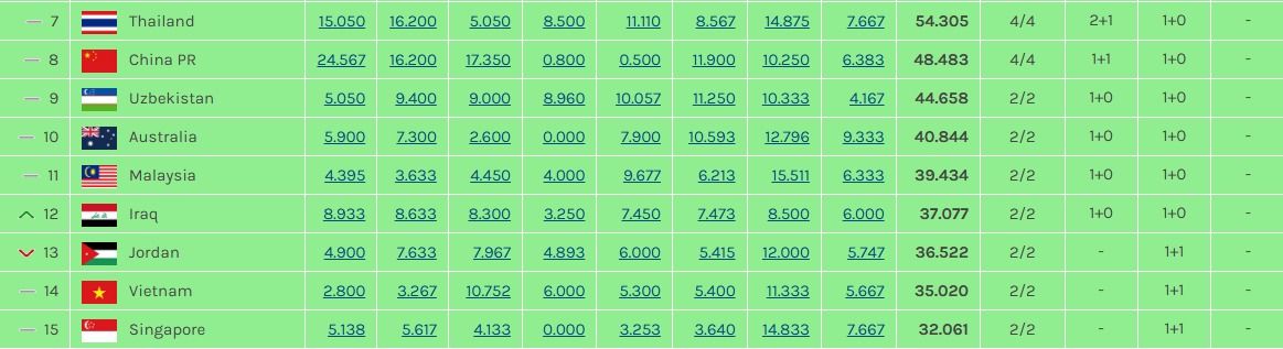 Malaysia kini berada di kedudukan ke-11 bagi kutipan mata MA ranking secara keseluruhan di Asia.
