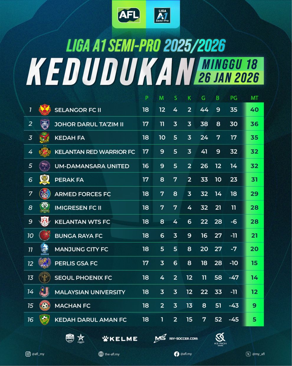 Kedudukan carta Liga A1 Semi Pro selepas pertembungan epik antara JDT II dan Kedah FA. — Facebook/AFL