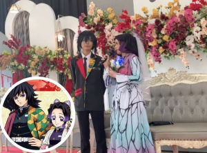 Bukan gimik! Pasangan mempelai tampil kelainan, 'dress up' busana karakter ikonik anime Demon Slayer